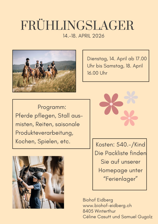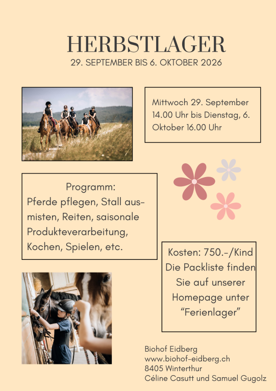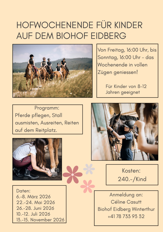 Céline und Samuel sind im Juli 2025 auf den Biohof Eidberg in Winterthur gezogen. Sie konnten dort per 1.1.26 einen Betrieb in Pacht nehmen. Auf diesem Hof werden weiterhin Ferien- und Wochenendaktivitäten angeboten.